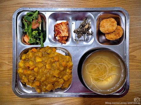 소고기카레라이스, 콩나물맑은국, 고구마고로케튀김, 찹쌀콩멸치볶음, 토마토참나물그린샐러드, 포기김치.