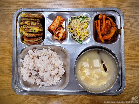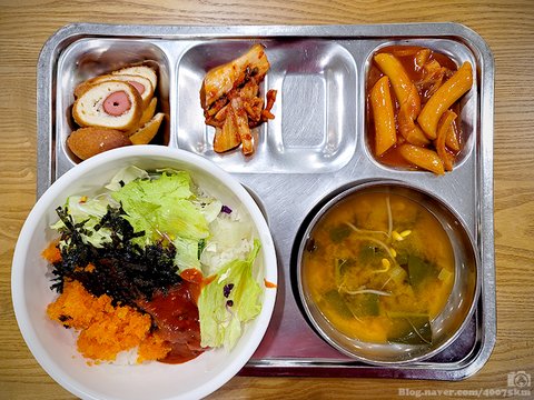 날치알야채비빔밥, 근대콩나물국, 핫도그퐁당떡볶이, 포기김치.