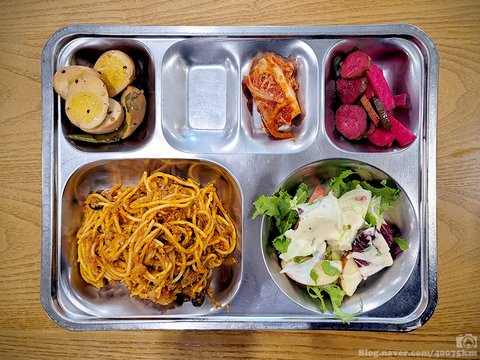 볼로네제 토마토 파스타, 잡곡밥, 콩나물김치국, 풋고추달걀장조림, 수제오이피클, 포기김치, 사과양상추샐러드.