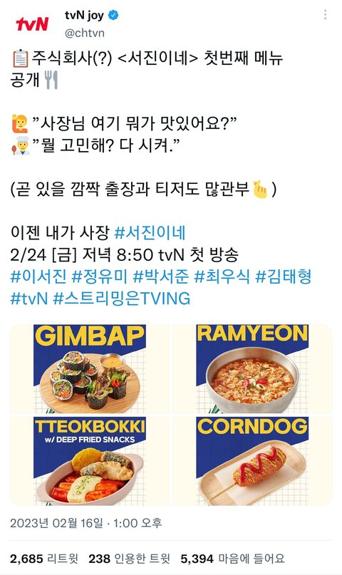 이서진x정유미x박서준x최우식x방탄소년단 뷔 <서진이네> 첫번째 메뉴 공개