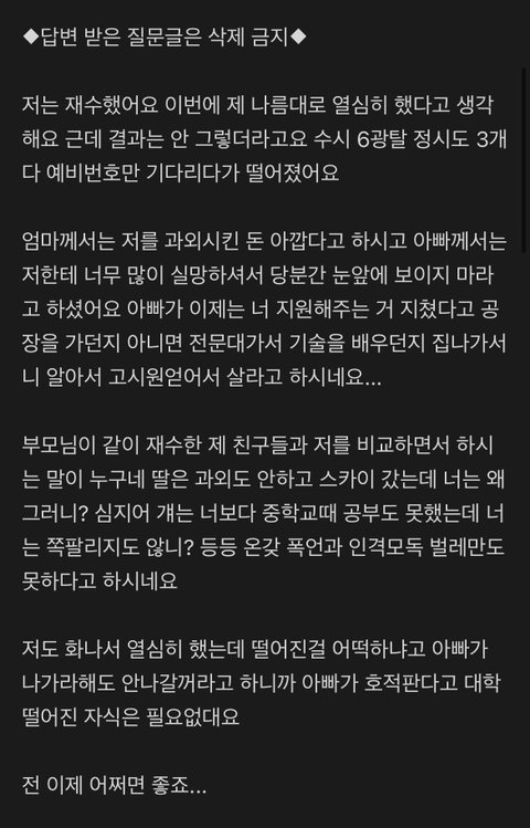 속을 까봐야지 돈이란 돈은 다 써놓고 공부를 안한건지 ... 실제로 안해놓고 답답하게 2년동안 등골 브레이커짓 오지게해놓고 공부도 설렁설렁하고 대학 못 가고 부모 탓하는 사람들 꽤 있음