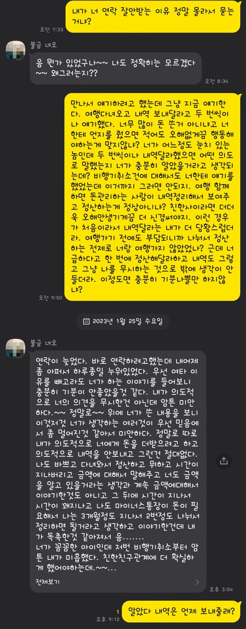 (내가 왜 네 연락을 안 받았는지 어쩌고 정산 내역 어쩌고)