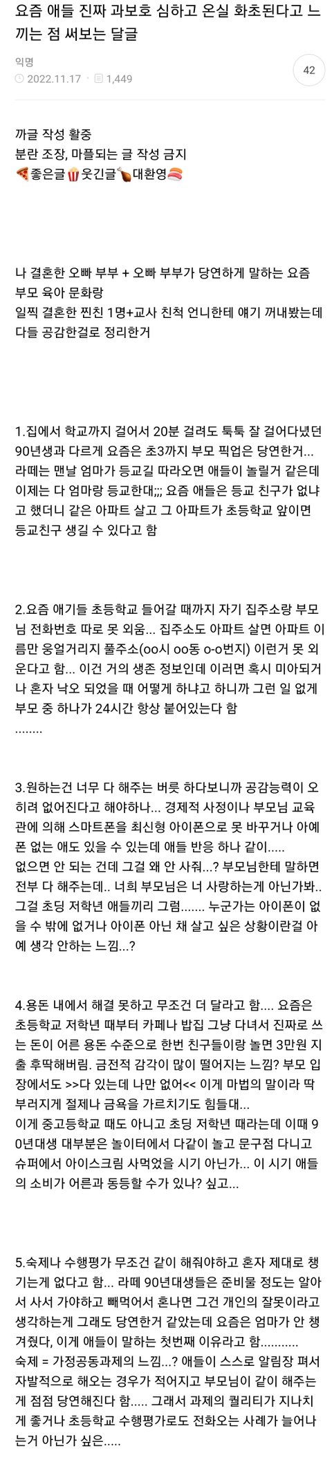 1번 5번만 공감합니다. 나머지는 개인마다 달라요. 1번 5번 공감하는 이유는 1번의 경우 요즘 세상은 예전과는 확연히 다른 위험한 요소가 너무 많습니다. 몇십년전에는 동네에서 공동육아 분위기라 어느집 누구인지 다 알고 이상한 사람이 보이면 함께 챙겼으나 요즘은 그렇지않죠. 예전엔 벗고 보여주는 변태였다면 요즘은 아동 성범죄자고 예전엔 돈달라는 납치였다면 요즘은 장기꺼내고 중국에 팔아버리는 납치죠. 초3 발랑까진애들은 소수고 사실 아직 많이 어립니다. 5번 같은 경우는 학교에서 아예 부모와 함께 하는 숙제를 많이 내줍니다. 준비물도 부모에게 알림장 어플을 통해 공지합니다. 그런대도 준비안하고 숙제안해온다면 부모탓이 맞겠죠? 나머지 번호들 경우는 아이들마다 다른 부분이라 공감이 안됩니다.