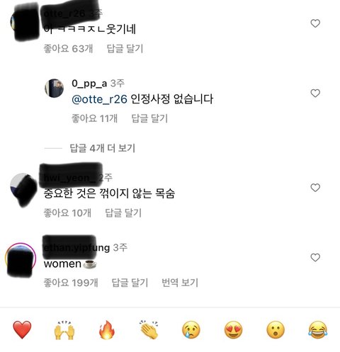 한달 정도 인스타 유머 게시물 뜰 때마다 댓글들 살펴보면 다 저러더라 그냥 좋아요 없는 댓글들이면 나도 무시하는데 저런 댓들이 좋아요 몇백개씩 받음 이게 우리나라 현주소야 얘들아