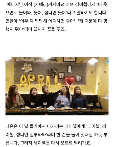 난 레이첼 몰카하는거 보고 정떨어짐.. 레이첼은 저러는거에 기분 나빠할 생각도 못하고 하라는대로 하는거 보고 그냥 평소 분위기 다 느껴짐 다른 뭐 투명인간취급하자고 몰카 주동하는거도 그러고