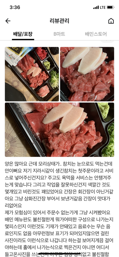 다시 본론으로 돌아가서. 완전 신규가게에 참치를 시켰는데 참치자체가 저렴한것도있지만 비싸서 어차피 돈주고먹는거 더비싼거 먹자싶어서 혼자먹는데 젤비싼거 시켰다 근데 신규가게라서 그런지 보통은 메뉴에 구성이 어떻고 뭐가 몇피스나가고 이런걸 적어놓거나 사진상으로 보여주는데 여기는 그냥 대뱃살로만 나갑니다 이한마디 뿐이 없었고 그냥 시켰다 배민리뷰이벤도 안하는가게에다가 배달비도 고객부담이 어느정도있는가게였다 절대 배달비 없는 가게는 아니였다 글그리고 필자는 항상 배달시킬때 영수증에 우리집 주소 찍히는게 싫어서 어디앞으로 와주세요 도착시 전화주시면 ㅊ받으러 갑니다 라고 요첨사항을 꼭 남기는편이다 그리고 전화해서 백김치 안먹으니 안주셔도된다고 전화 핬다 어느정도의 시간이 지나 전화가왔고 내가 톷·ㄱ하셨나요? 라고 물으니. 엄청 어버버하시면서 이제 출발 아니 곧 도착합니다 라고 ㅏ였다