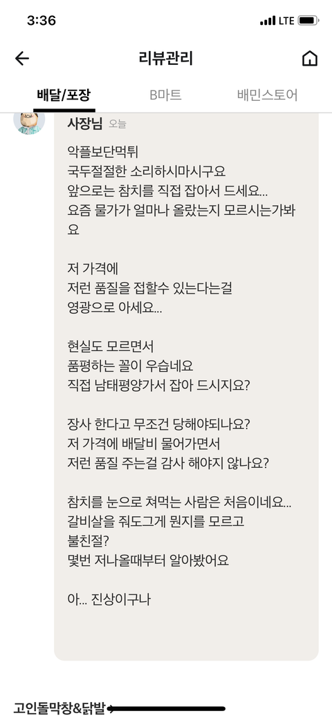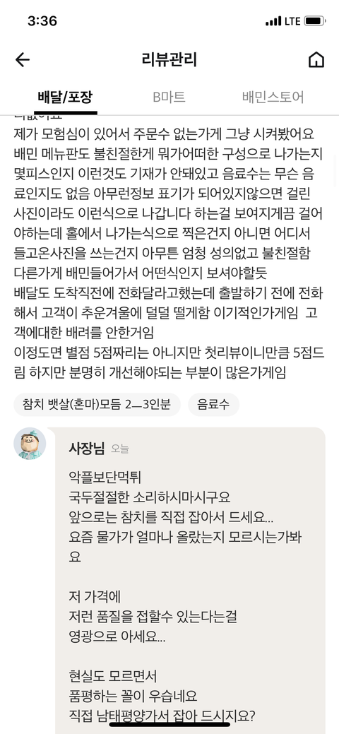 내가느끼기엔 출발도 전에 전화주신거 같드랬다 왜냐면 한참을 기다렸으니까.. 엄청추추웟ㅁ다 아므튼 받고 기분좋게연었는데 돈주고 먹고싶은 생각이 안들정도의 비주얼에 맛도 엄청비렸다.. 그리고 리뷰른달았는데 1점주고싶은거 꾹참고 신규가게라서 첫리뷰에 1점받으면 영업방해가되는거니까 일단 5점을주고 불만 사항 개샌사항을 적어나갔다 그리고 한동안은 잊고지냈다. 근데 한달만인가 답글 달렸다는 알림을보고 리뷰를봫다.. 진짜 나를 개진상으로보더라.. 어디가서 그런소리첨듣는다 보고 판단좀해주라 내가 진상이냐?