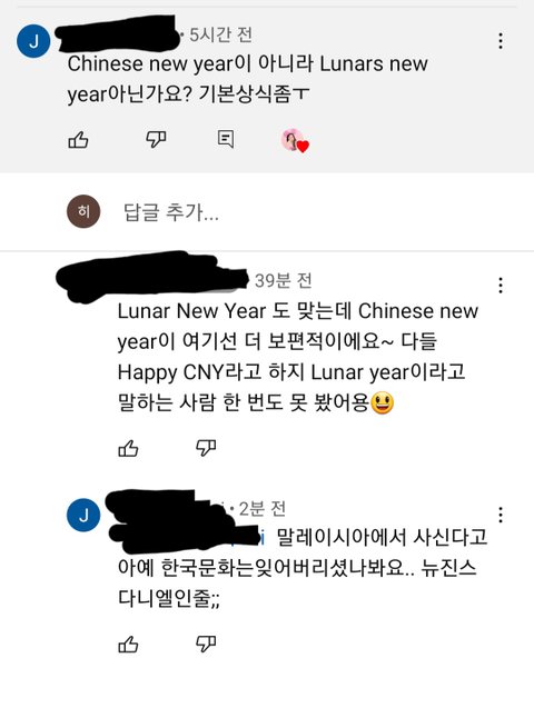 06년생 댄스.일상 유튜번데 외고에서 다시 말레이시아로 유학간 애가 Chinese new year이라고 영상에서 2번이나 말하길래 한 사람이 짚었더니 말레이시아에선 그런말 안쓴다고 언니까지 나서서 반박함ㅋㅋ
