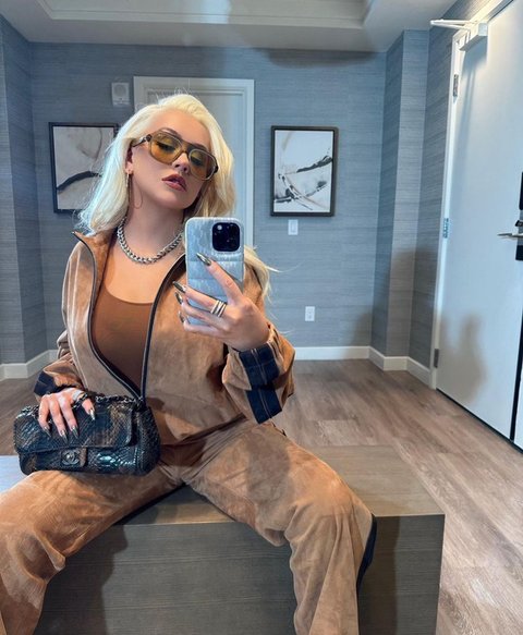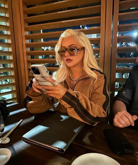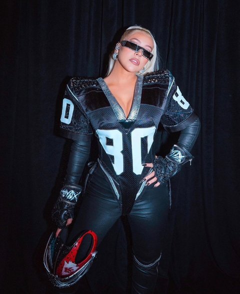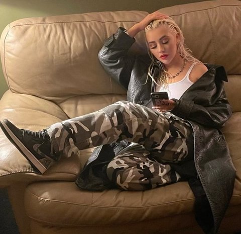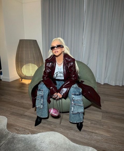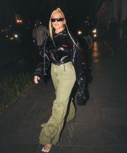 광택있는 상의에 카고 바지라...