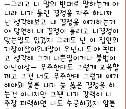 남편말이 무슨 뫼비우스의 띠마냥 계속 멤도는 이유는 결국 자기가 말하고자 하는 "내가 가장이니 내 의견이 무조건 우선시되야해"에 대한 타당한 이유를 못대서임. 계속 물론 너도 맞을때가 있겠지 내가 틀릴때도 있겠고 이런걸 인정은 해야 또 꽉막혀 보이지 않음. 틀릴 가능성도 언급. 근데 이게 웃긴게 만약에 쓰니가 맞고 남편이 틀린 상황 되면 "내가 틀릴때도 있다 했잖아?"하고 태연하게 넘어가기 위한 밑밥도 됨.ㅋㅋㅋ 말만 길고 장황하게 써서 그렇지 요약하면 일단 내말을 좀 들어라 토달지 말고 애 교육도 그렇게 시키고 내 말이 곧 법인 가족 분위기였음 한다, 근데 내가 틀릴 경우에도 ㅈㄹ하지 마라 임. 쓰니가 만약 똑똑하다면 얼마든지 논리 박살내버릴수 있는데 쓰니가 잘 생각하셈. 그냥 애 생각해서라도 남편 기 살려주면서 살지..