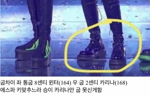 정작 에스파에서 키 제일 커서 타멤들이랑 키맞추려고 낮은 굽만 신어야하는건 카리나임 똑같이 높은굽 신으면 카리나만 머리하나 우뚝 서있어서 키맞추느라 늘 낮은굽 신음