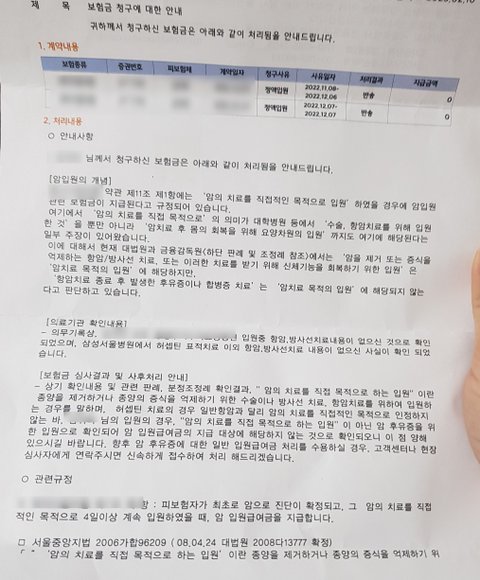 지금 암이 뇌에 있는데, 그래서 대형병원에서 치료를 받고 있는건데 이게 암 치료가 아니면 뭐냐 따져봐도 이미 법원 판례가 나와있다는 거예요....