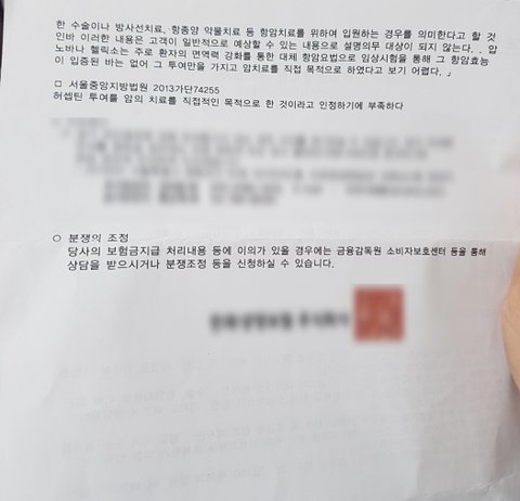 너무 억울해서 제가 물어봤어요. 허셉틴을 맞고 입원한 유방암 환자들에게 다 입원보험금을 안 주는 거냐고.