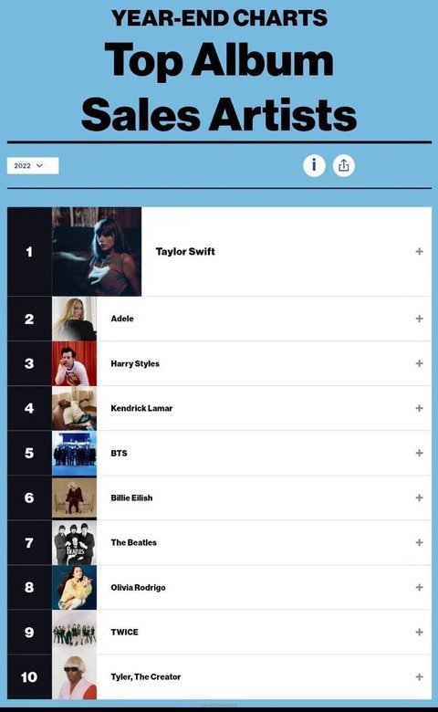 2022년에 팔린 아티스트의 모든 순수 앨범 합산