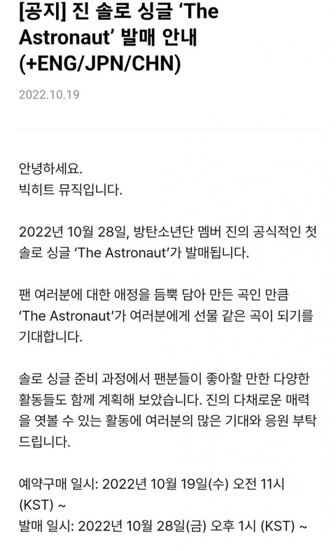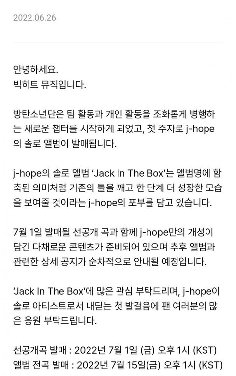 방탄 솔로 지원해준다니 그동안 제이홉 진 알엠 솔앨공지보면 알겠지만 예판일도 적게잡고 배송관련해서도 문제 조카많았는데 제일 중요한 초동성적올리기를 소속사가 방해함 대체 왜이런건데? 솔로 홍보도 안해 예판 배송때문에 성적까지 방해침
