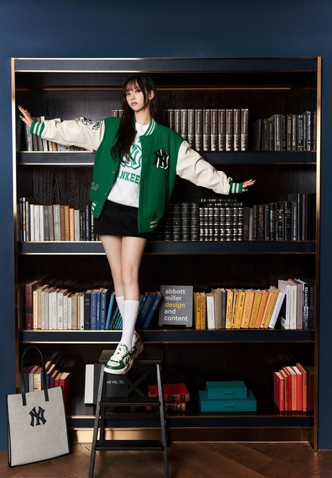 초록색 바시티 자켓에 배색 볼캡으로 포인트 줌