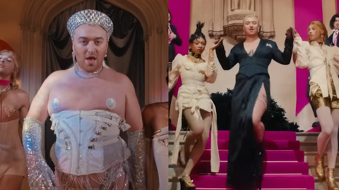샘 스미스는 ‘논바이너리(남성과 여성을 구분하는 이분법적인 성별 구분에서 벗어난다는 의미)’를 선언, 패션에서도 남녀 경계선을 허문 모습을 보여주고 있음