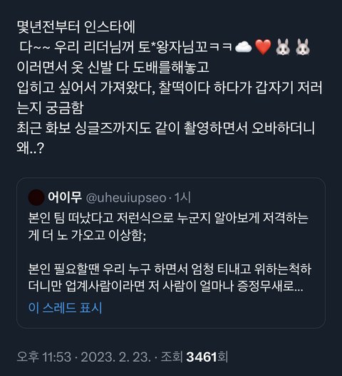 나도 처음엔 헉 했는데 찾아보니까 코디가 좀 신뢰성 없던데...전에 수호 스타일팀에 있다가 잠깐 나갔을 때도 수호 저격했다며 다시 팀 들어오니까 우쭈쭈하고ㅋㅋㅋㅋ여러모로 기분파인데다가 받은 증거 차고 넘치는 거 보면 믿을 건 못되는 듯. 잠깐이라도 휩쓸려서 실망한 내가 밉다 진짜 미안