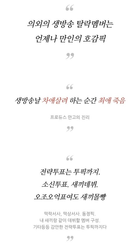 솔직히 걍 어그로일수도 있는데 차애 뽑는다는 애들 보면 뭔가 싶음 일단 최애가 아무리 인기 많아도 어떤 변수가 있을지 모르니까 무조건 최애만 투표 하는게 맞음 ㅠ
