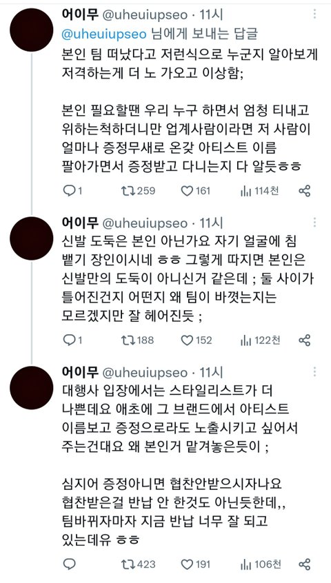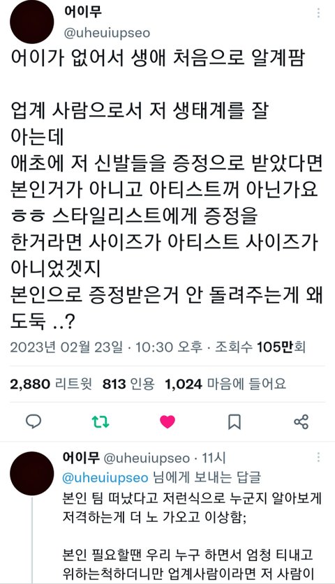 스타일리스트 ㅅㅎ담당일때는 나이키에서 증정이나 협찬으로 들어온거면 ( 거의 10개중9개는 협찬도 아니고 신상 처음으로 주는 거였음) 수호한테 처음으로 들어온거다 자기꺼 아니다 수호꺼다 ㅇㅈㄹ하다가 팀 옮기니까 저 ㅈㄹ하는거임?