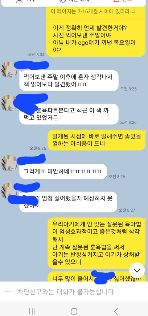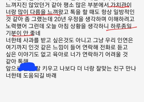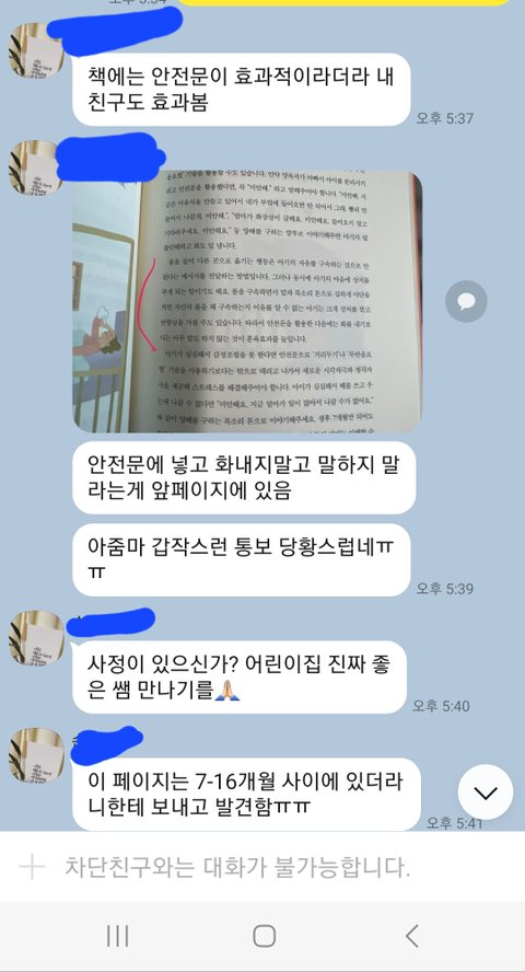 2돌 정도 되는 아기를 키우는 아기엄마입니다.아기가 재접근기에 자신을 때리는 공격성이 나타나,육아 고민이 깊었습니다.유튜브나 책을 찾아봐도 마땅한 방법을 찾지 못해 친구에게 상담을 한 결과, 친구는 아기를 펜스/안전문에 가두는 방법이 최고의 방법인 것처럼 알려주었습니다.친구가 소유한 책 내용을 여러 장 사진 찍어 카톡으로 받았고, 책에 나오는 내용이고(책을 신뢰하는 평소습관이 있음) 친구와 오랜 절친이었기에 친구를 믿고 알려준 펜스에 가두는 방법을 썼습니다.잘 걷고 뛰어다니는 아기를 펜스에 가두는 육아 방법은,가학적이었습니다.아기를 2~3분 잠깐 가두는 동안에도 아기는 눈물을 흘리며, 아픈듯이 자지러지게 많이 울었고 아기와 엄마의 애착관계 형성에 악영향을 준다는 생각과 아기를 정서적으로 학대하는 것 같았습니다. 5번 정도 펜스에 가둔 방법을 쓴 뒤, 이 육아법에 의심이 들어문화센터 선생님께 상담을 하였습니다. 문화센터 선생님은 이 시기에 공격성은 정상적인 반응이며, 보호자가 과도하게 반응하지 말고 단호하게 대처하면 된다는 심플한 답변을 받았고, 이를 친구에게 말했습니다.친구는 펜스에 가두는 방법이 아기에게 상처를 주고 부정적인 안좋은 방법이라는 것과 우리아기 개월수에는 맞지않는 육아법이라는 것을 이미 알고 있었습니다.이해가 되지 않는 것은 이미 자기는 다 알고 있으면서 저에게 수정내용을 말해주지 않은것과자신이 알려준 잘못된 방법을 제가 얘기를 꺼내지 않았다면, 계속 그 방법을 써서 우리아기는 정신적으로 점점더 잘못된 방향으로 나빠지고 있었겠죠?'방귀 뀐 놈이 성질낸다'고 친구는 갑자기 절교를 선언합니다. 친구와는 20년 넘는 친구사이고 친구는 현직교사입니다. 제가 바보같이 자기가 가르쳐준대로 따를 줄 알았는데, 자신의 의견에 문제점을 제시하고,전문가 선생님과 상담할 줄 몰랐는데 전문가와 상담하여 의견제시하고 그래서인가요? 친구의 행동이 전혀 이해 되지 않고 어이가 없습니다.자존감이 엄청 높은 사람이라 친구인 제가 조금이라도 부정적으로 얘기하는 것이 거슬리는 걸까요?친구가 알려준 잘못된 육아법으로 우리아기는 정서적인 아동학대를 당하였고 남편도 아기 우는 모습에 힘들어했습니다. 문화센터 선생님과 상담하지 않았다면, 계속 잘못된 육아법을 썼겠죠 그 점이 더 소름끼치게 무섭습니다. 마지막 문자에서 가치관 지적 당한거 기분 나쁘고요 ,평소에 서로의 가치관에 대해 진지하게 얘기나눈적이 없기 때문에 서로의 가치관을 모릅니다. 지적질하고 남 가르치려드는 태도 아주 기분 상하네요. 우리아기 정서적 아동학대를 당하였는데, 친구는 어른인 자기 기분이 나쁘다는 얘기만 계속합니다. 내 카톡으로 단순히 기분이 나빴나요?우리가족은 모두 힘든 시간을 보냈습니다. 살면서 이렇게 어이없는 일도 당하네요
