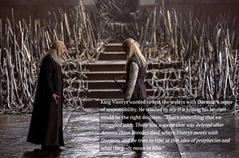 그것을 전달했다.King Viserys wanted to test the waters with Daemon’s sense of responsibility. He wanted to see if it telling his brother would be a right decision. "That's something that we struggled with. There was a scene that was deleted after Aemma died, where Viserys meets with Daemon, and he tries to hint at this idea of prophecies and what the gods meant to him."
