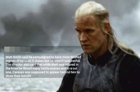 Matt Smith said he campaigned to have more deleted scenes of episode 3 shown but he wasn't successful. The director also said that while Matt was injured in the knee he filmed many battle scenes and in a cut one, Caraxes was supposed to appear behind him to show their bond.
