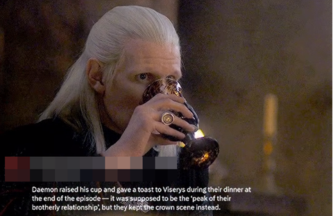 ㅡEpisode 8 :Daemon raised his cup and gave a toast to Viserys during their dinner at the end of the episode. It was supposed to be the 'peak of their brotherly relationship', but they kept the crown scene instead.