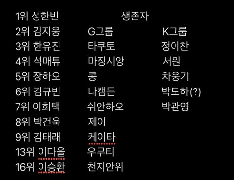 다 알려준 건 아니라 아직 모름(유승언 임준서 붙었다는 말도 없었음) -우무티 천지안위 박관영은 52위 후보라는 말도 있음 - 탑9 순위도 무작위라는 말 있음