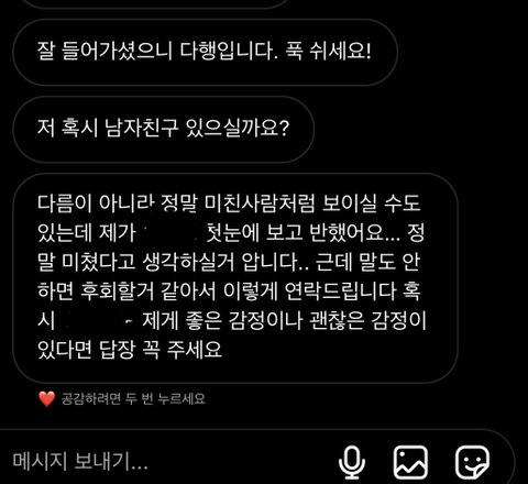 그런데 그 날 씻고 나오니 제 인별 디엠으로 친구 예랑이가 연락을 했더라고요. 처음에는 그냥 잘 들어가셨냐, 연락 하더니 시덥잖은 얘기 하다가 갑자기 혹시 남자친구 있냐 그러더니 진짜 미친 사람처럼 보일 수 있는데 그러면서 제게 관심이 있다고 그러더라고요…