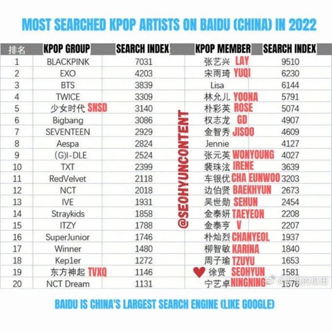 블핑-엑소-방탄 2022년 중국 바이두 에서 가장 검색 많이 된 케이팝 가수 순위