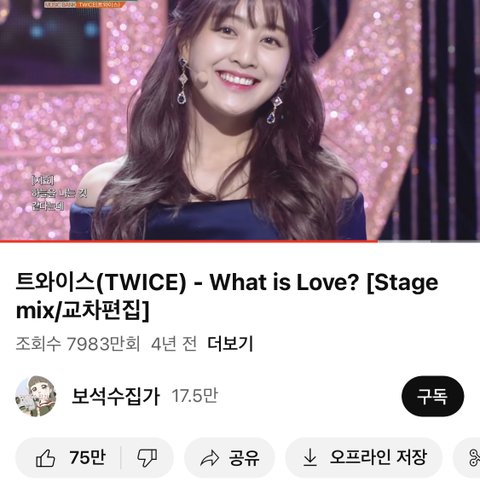 이거 교차편집 조회수 자꾸 늘어남 2020년 2월 쯤에 내 기억으론 분명 5천만 조회수였는데 나 말고도 이때의 트와이스 폼을 추억하는 사람들이 매년 1000만명은 된다는 거잖아.. 개쩐다…….