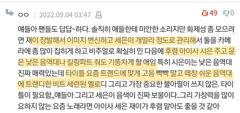 ㄹㅇ 이번에 다 좋은데 세은 좀 더 쓰면 좋겠음 아이사 세은을 밀어야돼 그래야 듣기 좋음 슬로우다운처럼