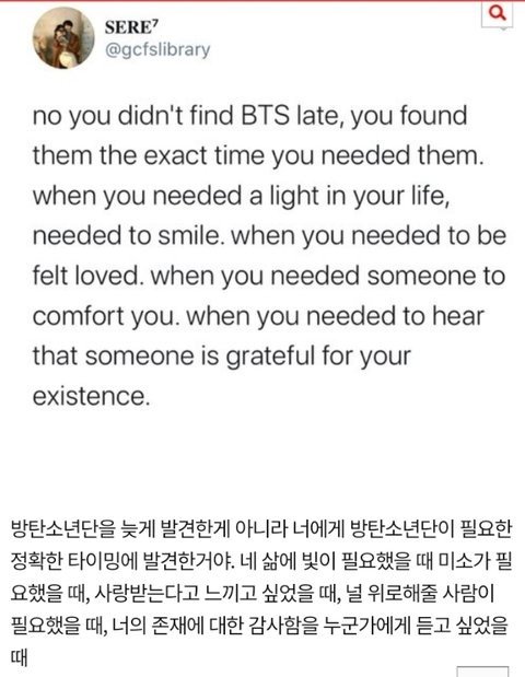 그래서 아래 글이 생각나더라고 방탄소년단이 필요했는데 찾아와줬어