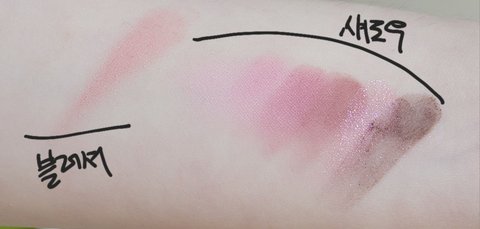 본론은 사진 보시면 제팔에 제가 지금 쓰고 있는 블러셔랑 섀도우 차례대로 발라놓은 건데