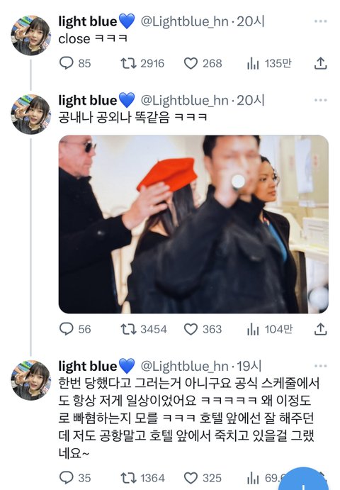 근데 저게 시큐리티가 할 일 아니냐? 애들이 상태가 항상 좋은 것도 아니고 사진 찍히기 싫은 타이밍도 있는 건데 파파라치처럼 맨날맨날 들이대면 어느 선에서 정리할 필요가 있지. 저 사람이 뭐 좋아서 저렇게 함? 경호 목적으로 하는 거지. 물론 홈마들이 웬만하면 보정 다 해주고 잘 나온 것만 올리니까 소속사가 잘 관리할 문제긴 함.