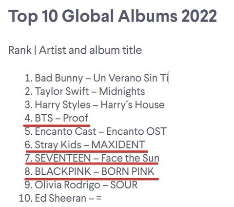 2022 국제앨범차트 탑10에 케이팝 4팀 실화