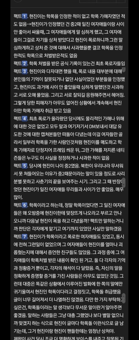 게다가 몇년전 일을 아직도 끌고와서 난리인거임 정작 폭로자들은 가만히 있는데 무슨 현진 칭찬글 마다 학폭돌이라고 하고
