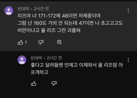 근데 추천수 최대가 159따리 댓글이고 나머지는 추천도 ㅈ도 없는 걍 말그대로 잼민댓글밖에 없구만 저런거 하나하나 가져와서 정병쳐먹을거면 돌판에 어떻게 있음...? ㅋㅋㅋ 그냥 적당히 무시하고 걸러 보셈 잼민이들 나대는거 하나하나 다 막고싶은거임? 심지어 판에서 저러는 애들 보이지도 않는데 판에서 화풀이해서 뭐함? 쟤네한테 답글 달고 오든가 왜자꾸 판에서 리즈 배척하는 글 써놓고 ㅈㄹ이야 한두번도 아니고 적당히 해야지 ㅋㅋㅋㅋ