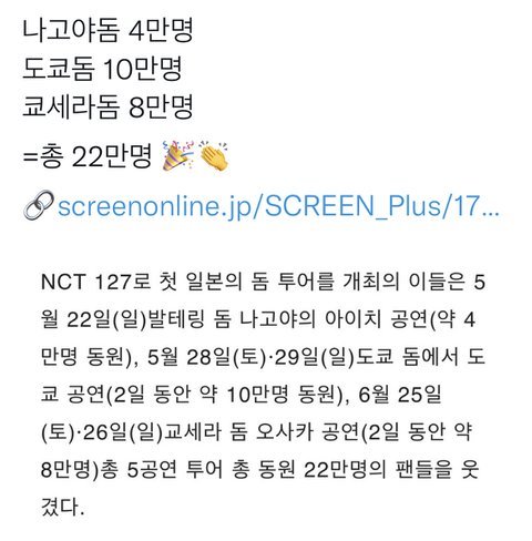 코시국에 한국인 입장제한으로 돔투어 매진할정도면 괜찮은편 아닌가 (엔시티가 일본 원탑 이런말 당연히 아님.. 절대 해외 아예 없다? 라할수준이 아니란거지 너무 후려치기 심해서 짜증남)