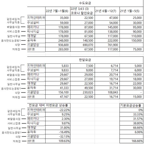 보시다시피 전부 살짝 오르거나 오히려 3,4,5월 코로나로 할인된 요금보다 더 적게 나온 가게도 있습니다.