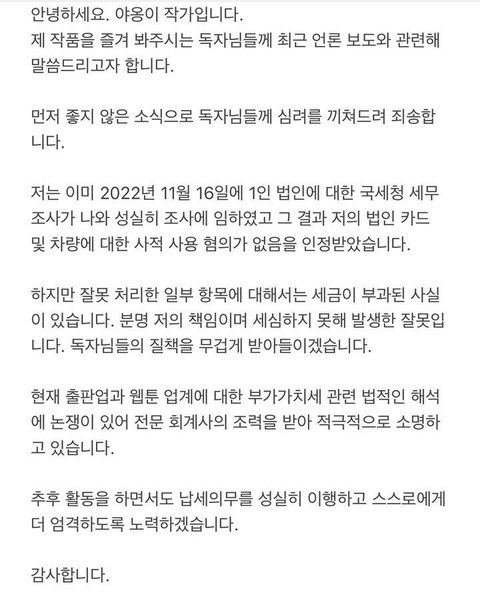 야옹이 작가는 지난해에도 탈세혐의가 포착되어 국세청의 세무조사를 받고 일부분 정상임을 인정받았다고 하였고, 극히 일부분에 대하여 정상처리받고 나머지는 철퇴를 맞았습니다.