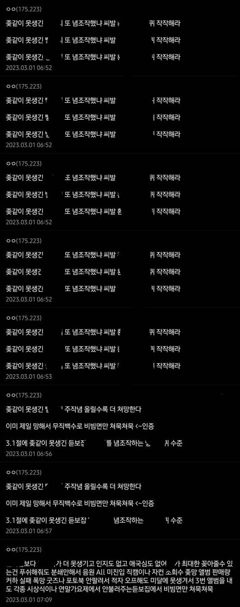 가린건 아이돌 이름=a인데 쟤 얘기만 나오면 그때마다 저 지랄임 아니 저 a 얘기 아니여도 심심할때마다 저렇게 도배함 그래서 별의별 생각을 해봄 뭐때문에 저렇게 정병을 갖게 됐을까.. ? 저 정병 가족중에 a때문에 죽은 사람이 있나도 진지하게 생각해봄