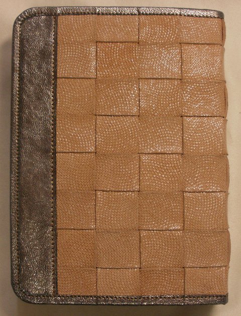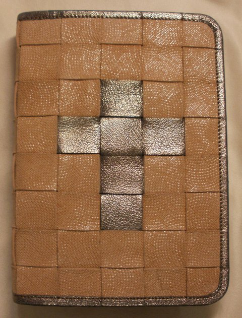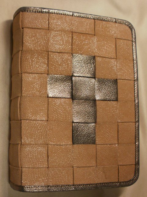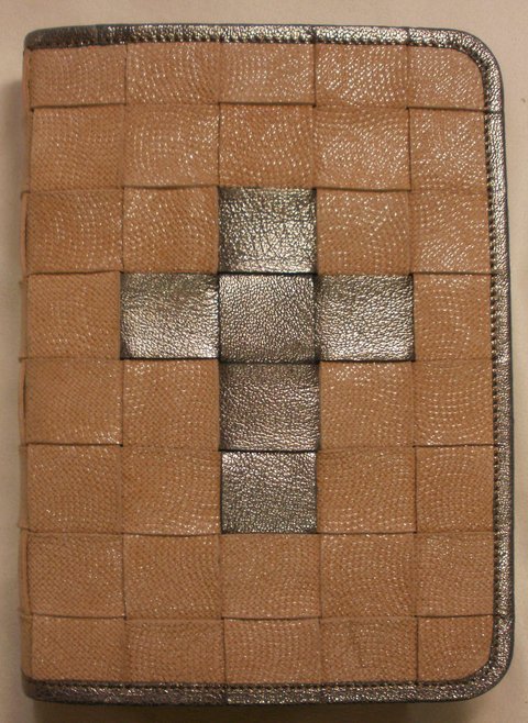 탄 컬러 엠보싱 천연 양가죽과 그레이 컬러의 호일 처리된 양 가죽을 콜라보로 엮어 제작한 메쉬 성경 커버(성경 케이스)입니다.(마디샤가죽공예)
