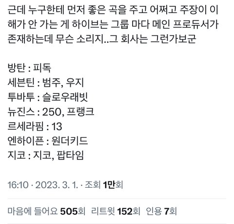 누가 보면 슴돌들 노래만 퀄리티 좋고 성적 좋은 줄 알겠네.. 현실은 하이브 레이블 돌들이 곡 퀄리티며 음원 음반 성적 다 좋은데 저런 말 하는 거 보면 웃김 하이브는 아이돌별로 전담 프로듀서랑 A R팀이 있는데 에스엠이랑 슴돌 좋아하는 애들은 저번부터 왜 자꾸 하이브 돌들 가지고 넘어지는지 모르겠네;; 이거 하나는 알겠음 스엠이고 슴팬이고 둘다 하이브랑 하이브 돌들 특히 방탄한테 열등감 심하게 갖고 있었다는 것만 알겠음. 경쟁사인 하이브도 자기네처럼 운영하는 줄 알고 저런 쌉소리를 하는 거 보면 경쟁사에 대해선 공부를 1도 안 했던 거 봐선 하이브나 카카오가 개입을 하질 않았더라도 언젠간 스스로 망했을 회사라는 것만 아주 잘 알겠음.