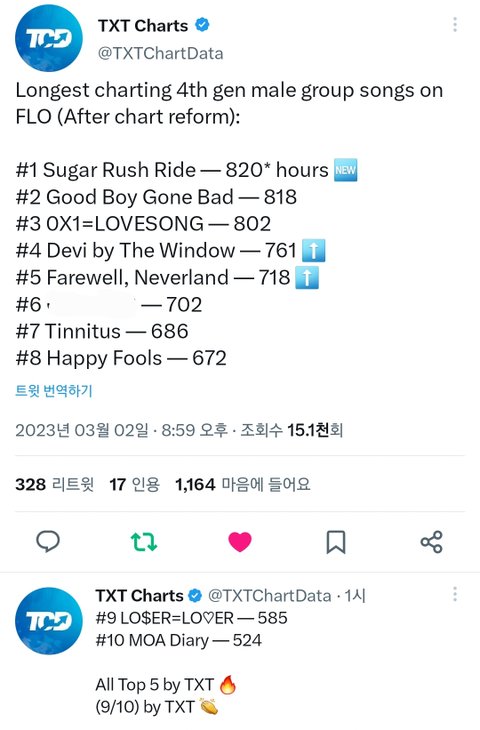1위부터 5위까지 당연히 다 우리고 총 10위 중에 9곡 ㅎㅎ