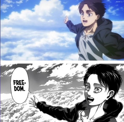 이거 바탕이 하늘처럼 보여서 밑에 구름이라고 생각하는 사람들도 있는데 저거 사실 구름이 아니라 땅울림 거인들 때문에 생긴 증기임… 근데 애니는 그냥 구름으로 그렸네…