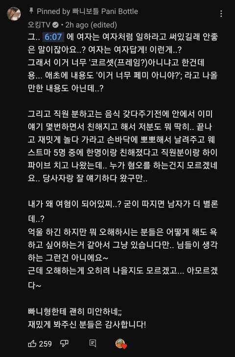 유튜버 빠니보틀 올라온 호주여행 영상인데 음식점에 걸린 여성주의 팜플렛 보고 하는 소리라는 게 '이거 너무 페미 아니야?' 페미를 욕설처럼 쓰는 것도 그렇고 가게 보니까 유방암 후원 캠페인까지 하는 곳이더만 그런 곳에서 굳이 지가 안티페미라는 걸 티내고 싶나