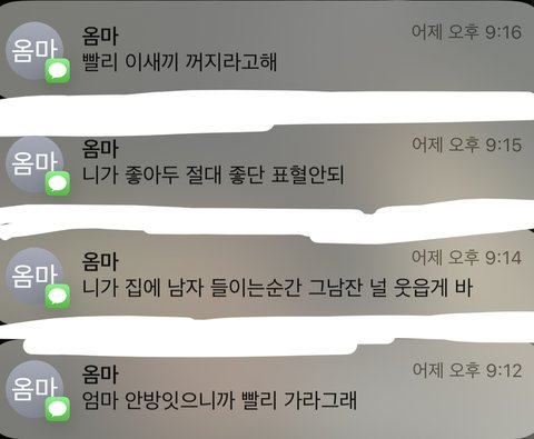 어떡하지 진짜 진지하게 나 아까 혼자 집에 있었는데 갑자기 집 들어오자마자 온방문 다 열면서 니 남친 빨리 나가라고 하라고 죽여버린다 그러는거야 사실 전에 내가 엄마 없을 때 남친 데려왔다가 들킨 적 있었거든 그때 충격 되게 많이 받긴 했었던 것 같은데 갑자기 욕 퍼붓고 그러니까 걍 짜증나서 스카 와서 폰 꺼두고 공부했담 말임 근데 문자 온 거 보니까 진짜 내 남친이 우리집에서 숨어있는 줄 아는 것 같음..; 사실 집에 엄마밖에 없었는데 조현병인가 이거 뭐 어떻게 해야 되지