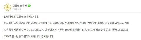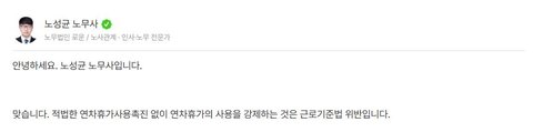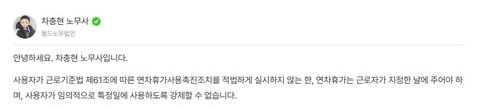 하지만 근로자의 연차휴가란 회사의 사업 운영에 막대한 지장이 있어 그 시기를 변경해야 하는 경우가 아닌 한 법정 연차휴가는 근로자가 자유롭게 사용할 수 있는 권리이며